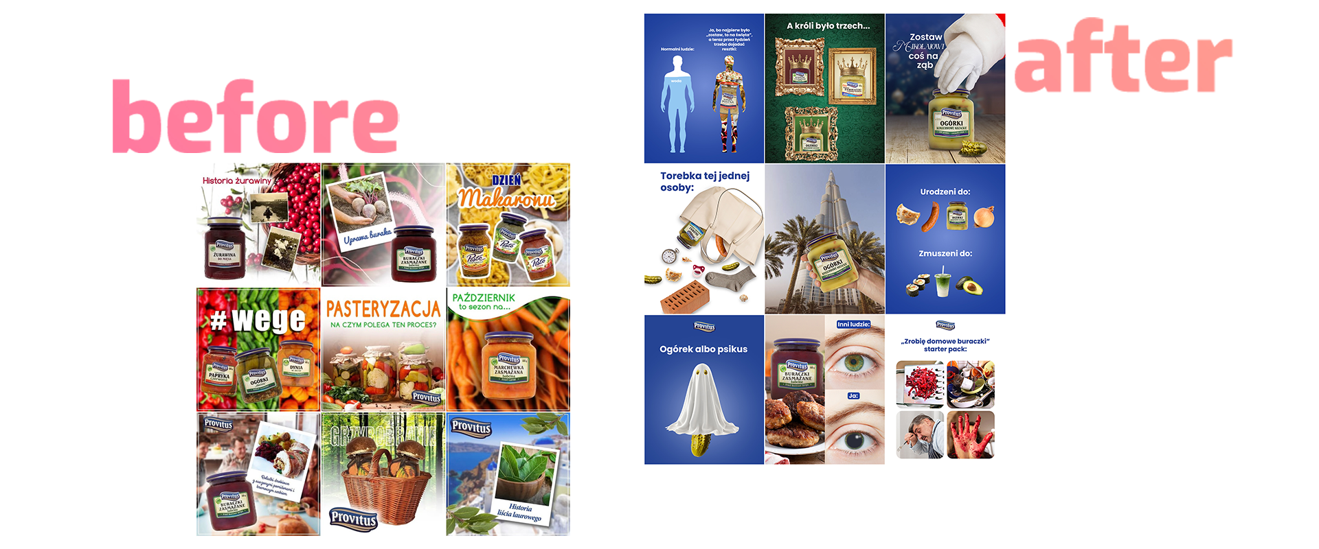Dla marki Provitus – producenta przetworów – tworzymy spójny i charakterystyczny wizerunek w social mediach. Odpowiadamy za koncepcję kreatywną, projekty grafik oraz budowanie estetyki profilu. Stawiamy na lekką, zabawną komunikację, która łączy domowy klimat z nowoczesną formą. Naszym celem jest nie tylko ładny feed, ale przede wszystkim budowanie relacji z odbiorcami poprzez humor, autentyczność i codzienne, bliskie sytuacje